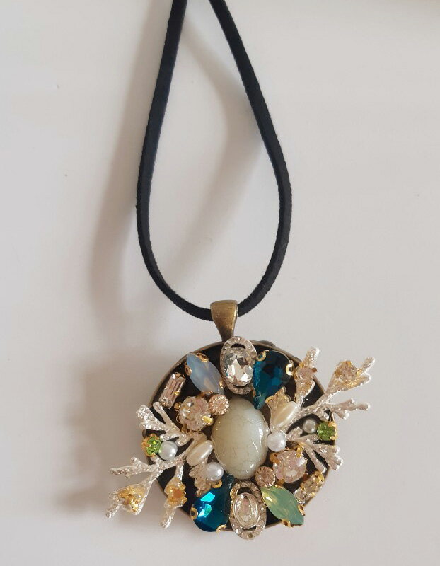 ●商品名 ゴージャスビジュ−のペンダント×ブローチ ※合成皮革ひも付き ●サイズ 縦5cm、横6.5cm 商品画像につきまして、撮影状況やご使用のモニター環境により、実際の商品の色合いと多少異なって見える場合があります。
