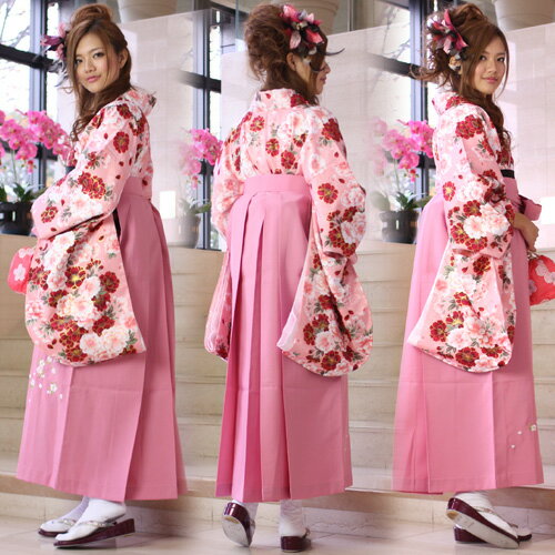 【レンタル】 卒業式 袴 レンタル 大学 女性 袴セット 卒業式袴セット2尺袖着物&袴 フルセットレンタル 小学生サイズあり 「ピンク地に赤とピンクの金彩八重桜」〔消費税込み〕