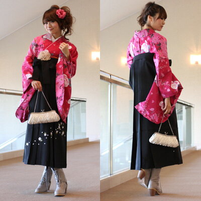 【レンタル】二尺袖 袴 16点セット (着物+袴+半幅帯+着付小物+巾着+草履) レンタル【往復送料無料】g147 牡丹 桜 赤 卒業式 袴 レンタル 晴れ着 女性 袴 着物 小振袖 卒業袴